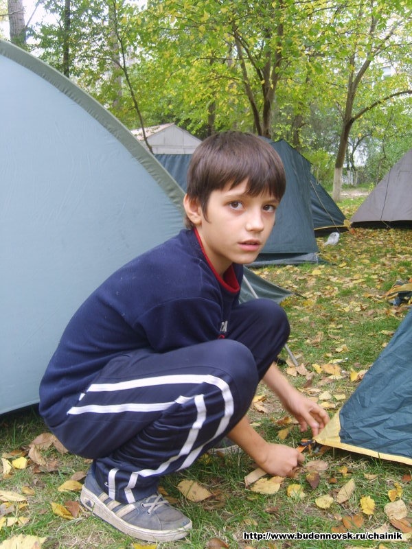 Женя Ульянкин ставить колышек палтки