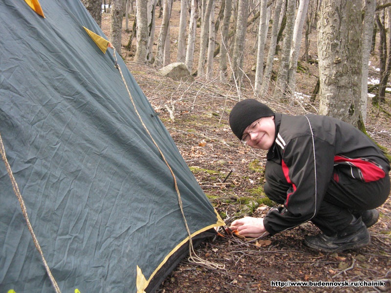 Леша ставит палатку.